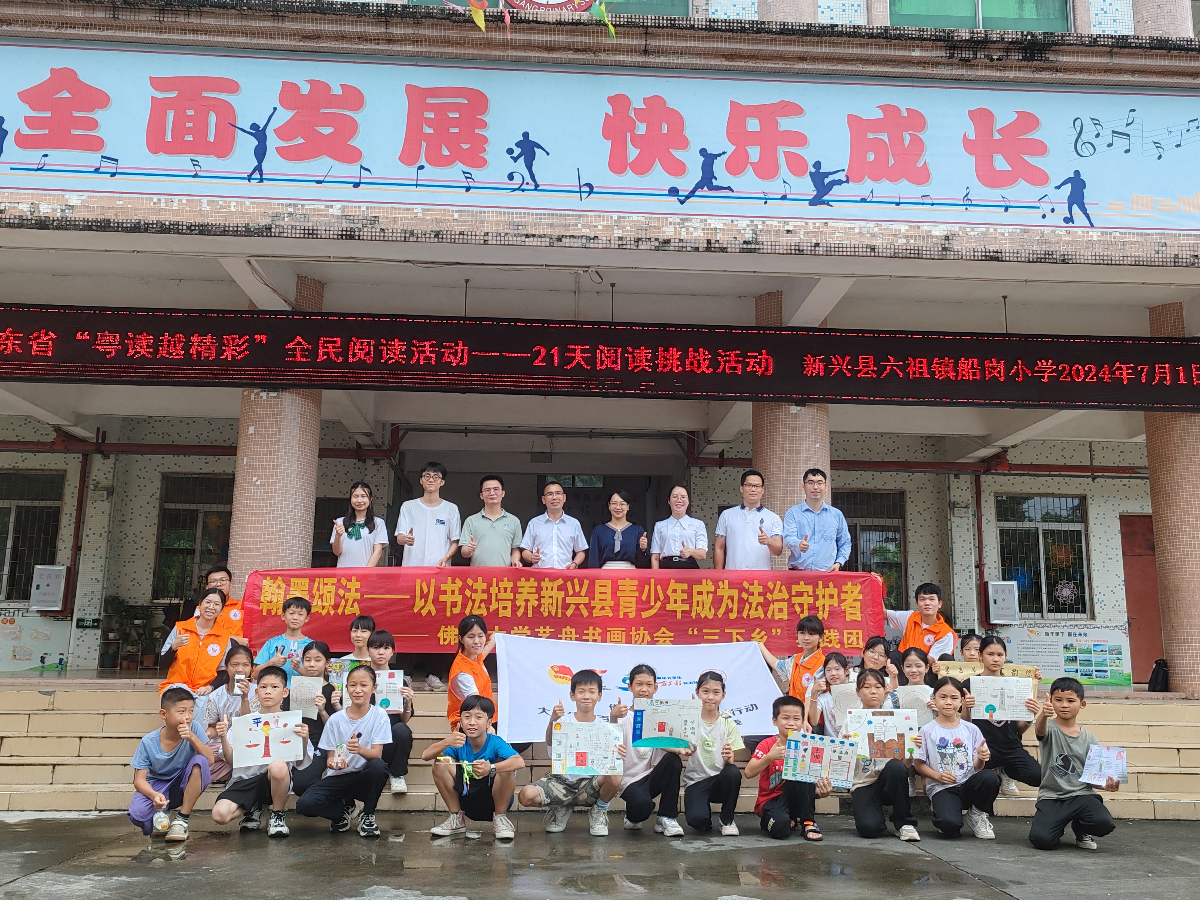 近日,佛山大学法学院艺舟书画协会实践团奔赴云浮市新兴县船岗小学,开展为期10天的青少年乡村公益夏令营。青年学子们将普法知识融入硬笔书法、绘画等形式中,让孩子们学习法治,感悟法治。