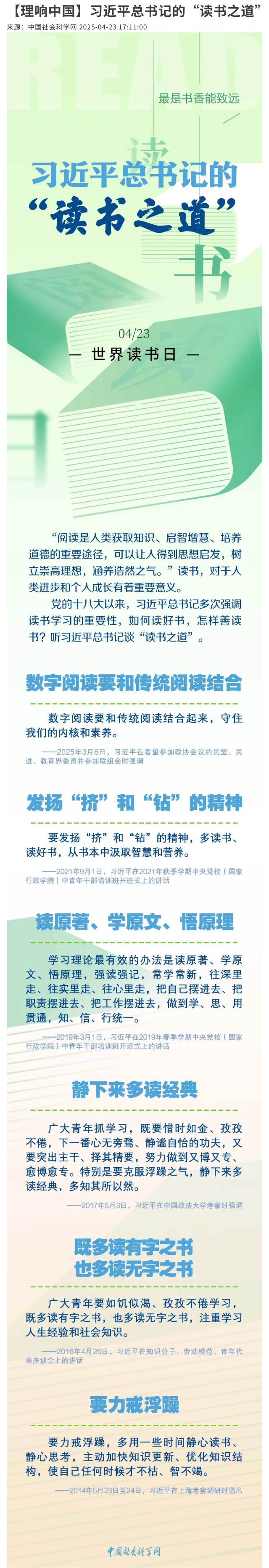 理解“读书之道”,享大好年华。我一定会牢记习主席的话:数字与传统相结合,发扬“挤”和“钻”的精神,参悟根源,静心戒躁的读有字和无字之书