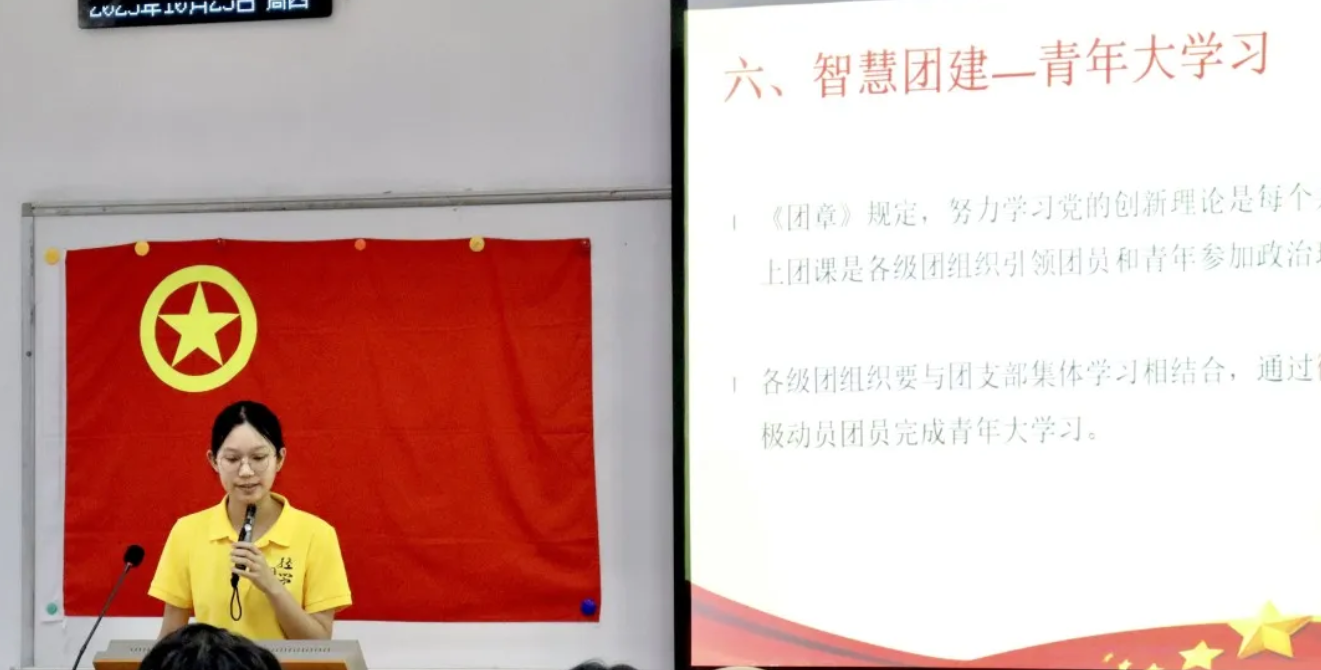 智慧团建系统是团务精细化管理的核心工具。组织部沈柔对智慧团建系统的使用进行了培训,聚焦团费缴纳、教育实践录入、及时响应率、两制工作、青年大学习五大板块,其中重点强调各支部当月团费交纳率与两制率力求达到100%,各团干需在48小时内及时响应智团业务。其中提出团支书应向团员强调遇到需审核内容时主动联系团支书进行审批,以防遗漏审核。