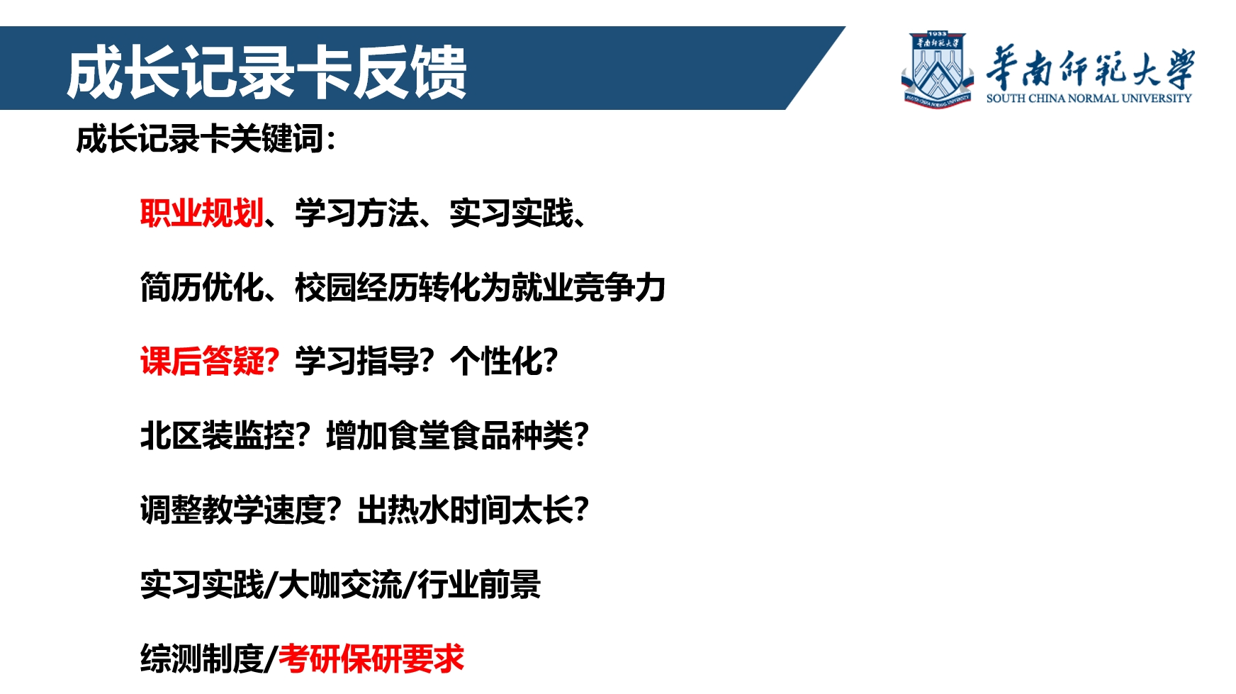 然后,陈老师分别进行了新学期安排、反诈教育和成长记录卡反馈。他表示在新学期要从年级层面进一步加强学风建设,为大家提供更多的生涯规划交流机会。同学们也要在自行做好职业规划并为之努力奋斗的同时,重视人身安全、财产安全,保护自身合法权益。
