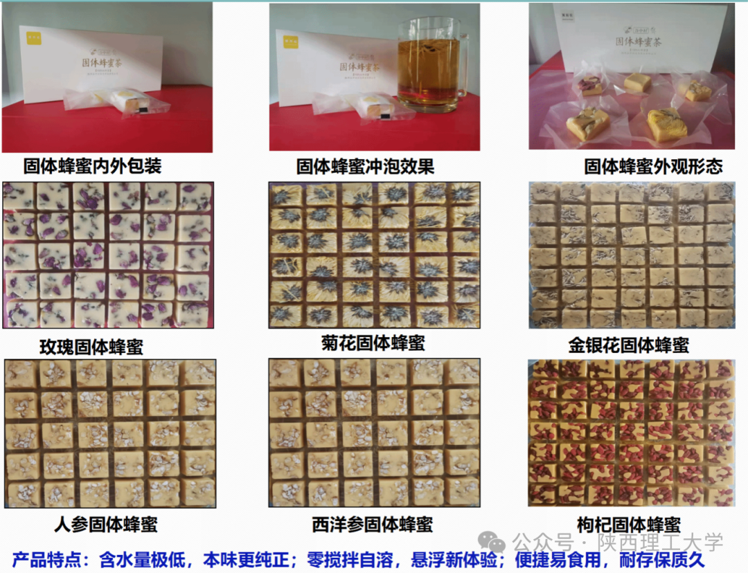 郑红星副教授团队以蜂蜜为原料,采用了课题组首创的阶梯式干燥技术,成功将蜂蜜含水量由原来的20%降至3%,该技术用于生物健康产品开发,可作为药用粘合剂,干法制备各种蜜丸或片剂,还可制备一系列固体蜂蜜饮品,具有贮藏、携带、食用方便等优点,填补国内外固体蜂蜜高端产品市场空白。