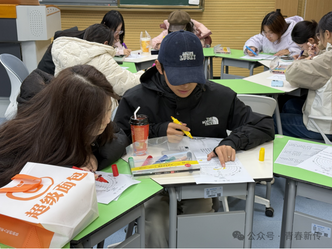 活动中,团体辅导活动指导、学院辅导员尹靓老师,详细解读了生涯彩虹图的核心逻辑:以年龄为横轴,以角色(学生、职场人、家庭成员等)为纵轴,通过不同阶段角色的权重变化,直观呈现人生各阶段的发展重心。在老师的引导下,同学们结合自身兴趣、能力与目标,亲手绘制专属生涯彩虹图,认真标注当下的核心角色与未来的职业期许。