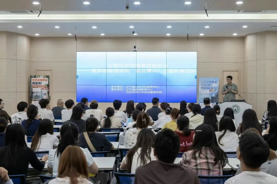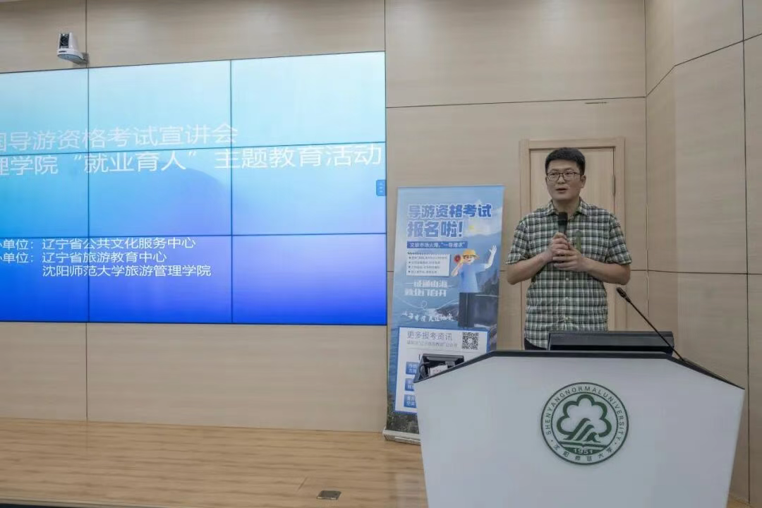 为贯彻落实国家“稳就业、保就业”方针政策,不断提升学生就业竞争力,引导学生树立正确的择业观、就业观,助力更多学子在文旅行业实现职业理想。6月23日下午,导考逐梦 职途扬帆——旅游管理学院“就业育人”主题教育活动在知行楼102多功能报告厅成功举办。本次活动特邀辽宁大学文化和旅游标准化中心主任、海洋经济研究院副院长、博士生导师郭舒教授担任主讲专家。辽宁省旅游教育中心党总支书记、主任赵瑞雪,副主任赵悦,考试部部长张英,以及旅游管理学院领导班子出席活动。旅游管理专业全体在校生参与,活动由旅游管理学院院长隋鑫主持。