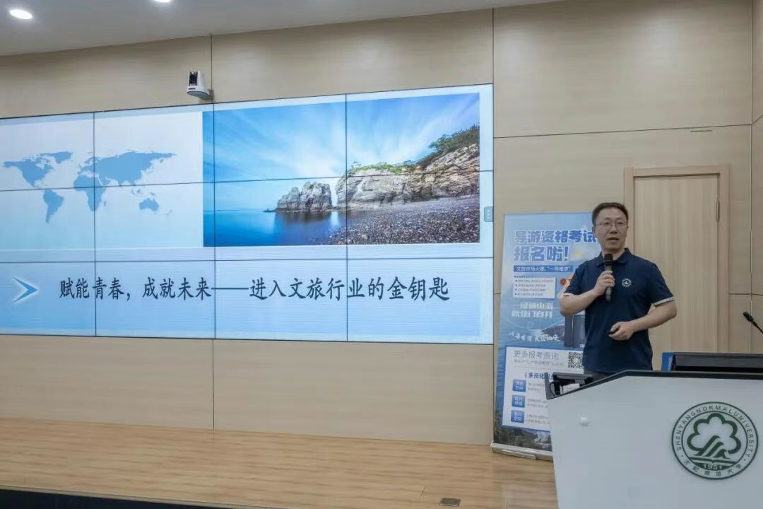 报告会上,郭舒教授系统解读了全国导游资格考试相关政策,深度解析了文旅行业发展新趋势,结合行业成功人士案例,详细介绍导游职业发展路径与就业前景,并围绕“文旅融合”“数字化导游”等新趋势,剖析了导游职业的多元化发展路径。他强调:“导游证不仅是行业准入的‘敲门砖’,更是提升综合竞争力、拓宽就业视野的重要工具,是新时代学生就业的‘*’。”这场兼具理论高度与实践深度的分享,全方位激发学生报考意愿与从业热情,为学生制定科学职业规划、树立理性择业就业观念提供了专业指引。宣讲结束后,同学们踊跃提问,就职业发展瓶颈突破、考试备考策略等问题与专家展开深入交流,现场互动氛围热烈。