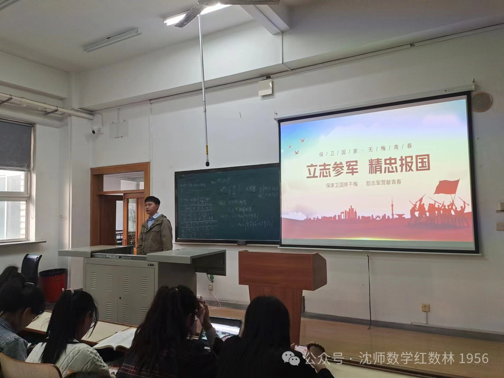 2024年4月16日,数学与系统科学学院在博文楼举办“立志参军精忠报国”征兵宣传主题活动。此次活动以线上线下相结合的方式进行,吸引了学院200余名同学的积极参与。我院退役士兵大学生马赏和张馨丹分别通过线上和线下参加活动并作动员宣讲。活动由辅导员郑浩主持。