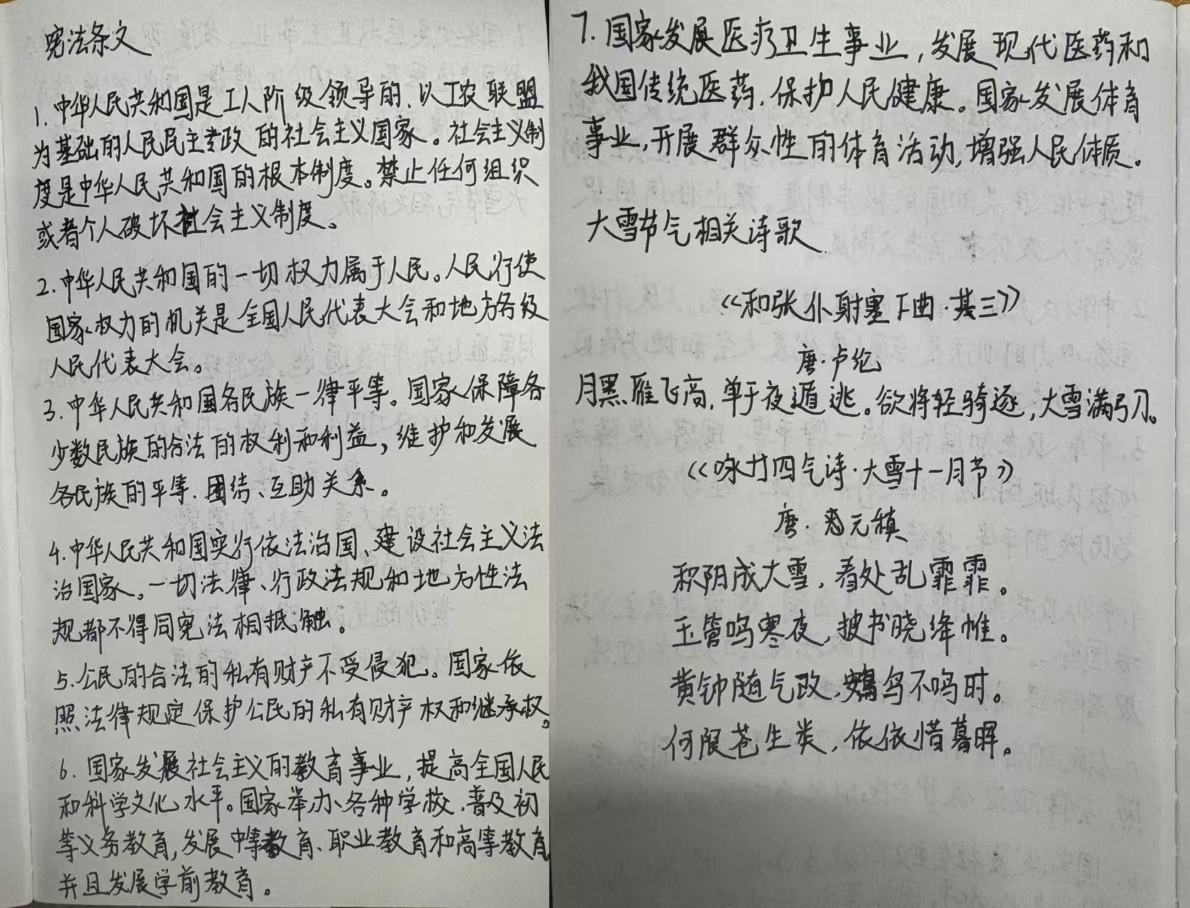 经济学院经济1242刘茵垚202411511214通过这次抄写宪法条文和大雪节气的诗谚,我不仅重温了宪法的核心内容,更在一笔一划间感受到法律的庄严与权威。宪法作为国家的根本大法,明确了公民的权利与义务,也为社会运行提供了坚实的法治保障。而大雪节气的诗歌与谚语,则让我领略到古人对自然变化的细腻观察与生活智慧,感受到传统文化中天人合一的理念。两者看似不同领域,却共同体现了秩序与和谐的价值——宪法构建了社会的制度秩序,节气文化则展现了人与自然的和谐相处。今后我会更加自觉地学习法律知识,增强法治观念,同时也会关注传统文化的传承与发展,让法治精神与文化底蕴在日常生活中相互滋养、共同促进。