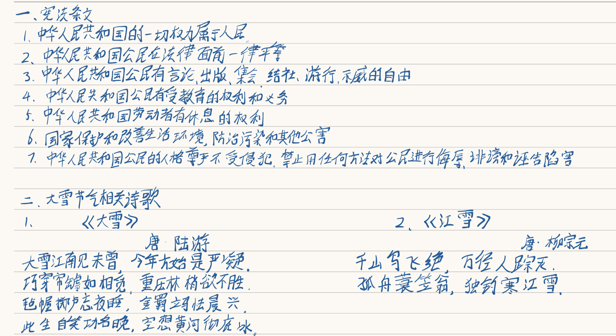 参与本次“以节气润文化,以宪法铸信仰”活动,让我收获颇丰。大雪时节万物潜藏,沉淀蓄力的特质,恰如宪法精神根植人心、厚积薄发的力量。手抄宪法条文时,我深刻体会到“一切权力属于人民”“公民在法律面前一律平等”等条款的庄重与温暖;品读节气诗歌与谚语,又感受到传统文化的深厚底蕴。此次活动让我明白,传统文化是精神根基,宪法是行为准则,二者相辅相成,今后我会持续践行宪法精神,传承节气文化。