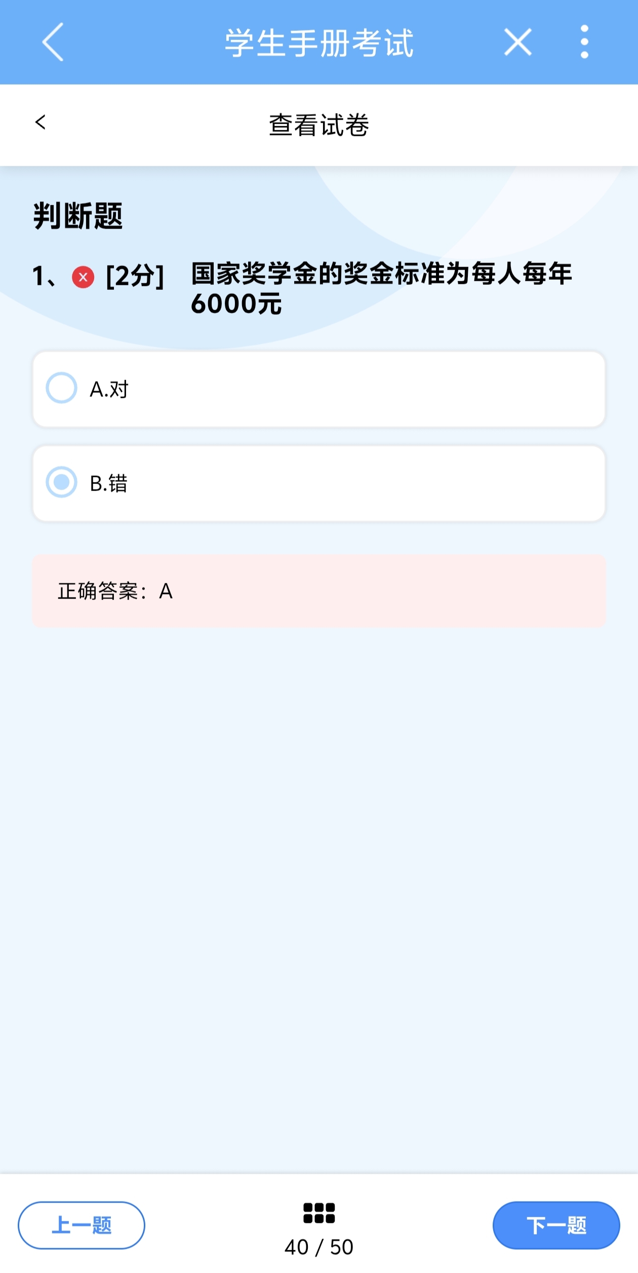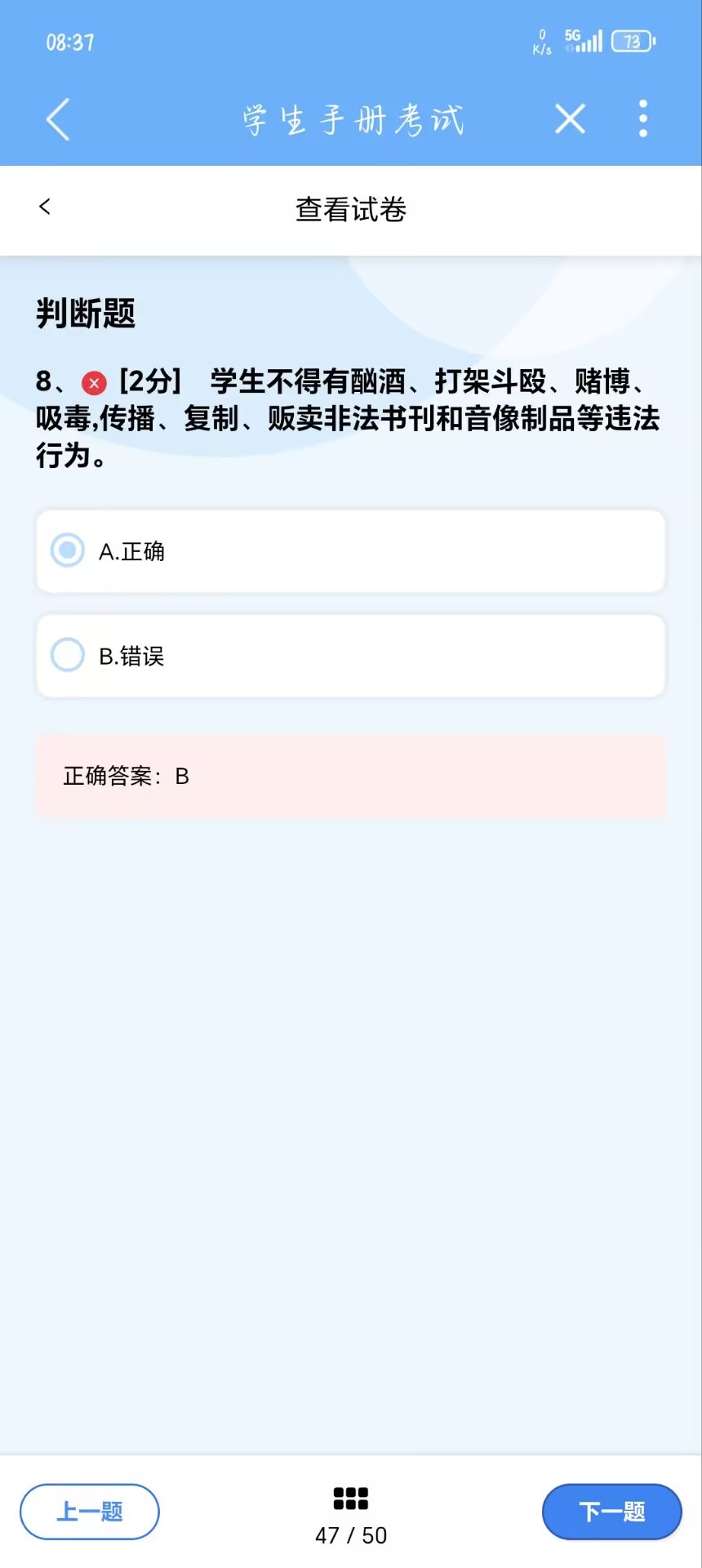 8、[2分] 学生不得有酗酒、打架斗殴、*、吸毒,传播、复制、贩卖非法书刊和音像制品等违法行为。 A.正确 B.错误 系统的正确答案:B。 手册正确答案应该为A