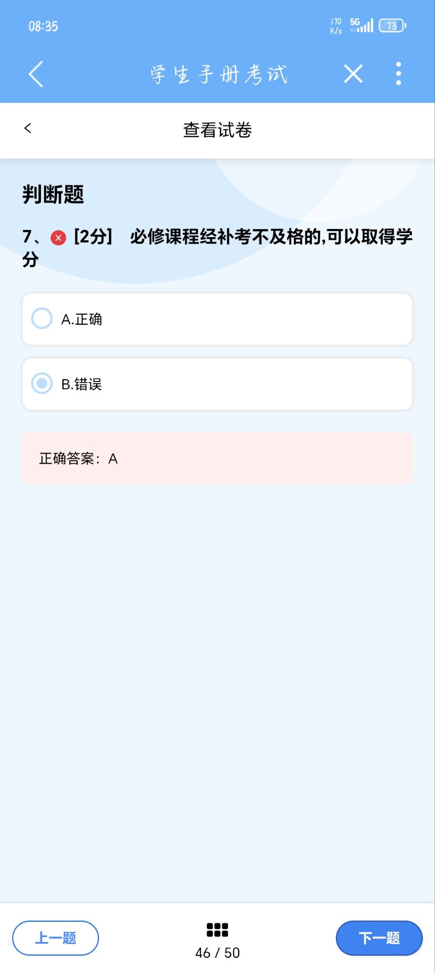 7、[2分] 必修课程经补考不及格的,可以取得学分 A.正确 B.错误 系统的正确答案:A。 手册正确答案应该为B