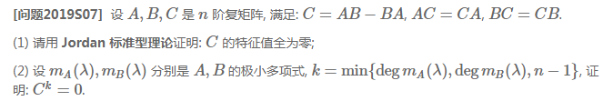 第二张图片中间部分有问题。由于P^{-1}CP=J中所有Jordan块的特征值都是0(相同),故只由AC=CA以及BC=CB一般得不到P^{-1}AP和P^{-1}BP有对应的分块对角形式。另外,第1小问要求是用Jordan标准型理论,而不是用trace。