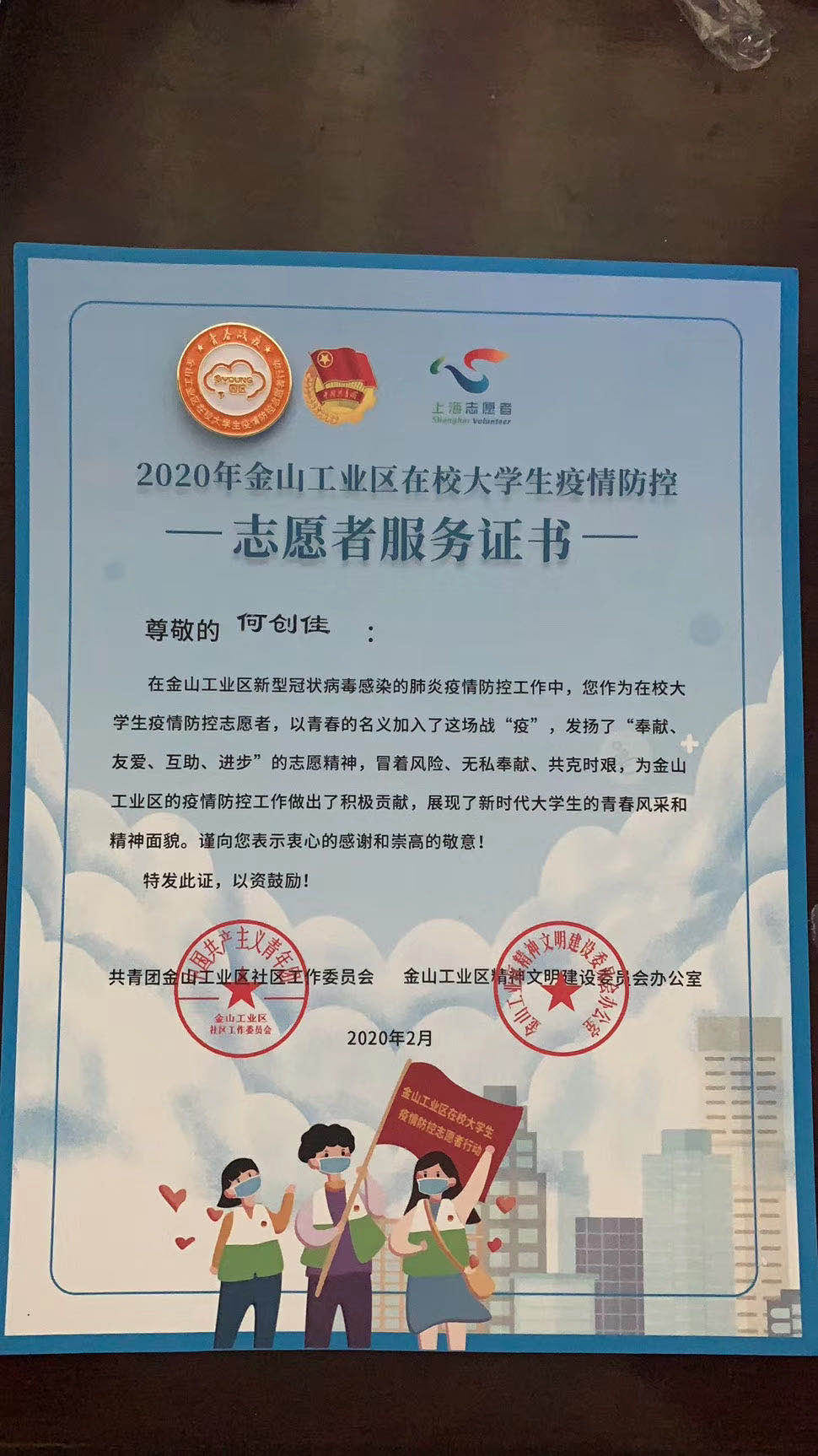 在生活上,他热心帮助同学,与同学们一起进步,以建设祖国为自己的目标,时刻关心国家大事。日常生活中勤俭节约,重视自身的规划,对于生活,学习,工作能够妥善安排时间。在寒假生活中他还积极响应共青团中央关于返乡大学生加入社区战“疫”的号召,参加了金山工业区大学生社区防疫志愿者。并且在班级团支部开展了线上小组会议,倡导积极响应号召积极参与社区防疫,加强班级团员思想建设。