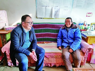 邱军(左)在乔川乡村民家中宣讲扶贫政策(2019年1月25日摄)。新华社发