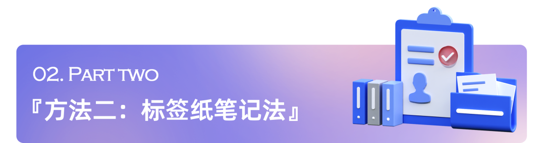 - TIP: 同样我们可以利用标签纸的不同颜色和大小,对不同类型的内容进行区分,提高后期的检索精度;