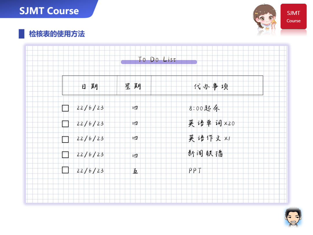 检核表,也就是我们经常使用的 To Do List。在制作检核表时,我们可以将我们的日常工作按条罗列,在完成事项后进行标记,确保我们不遗漏任何事件。