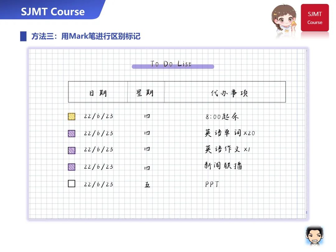 可以使用不同颜色的Mark笔区分事件的完成情况