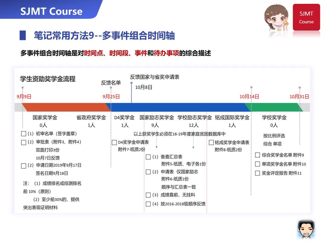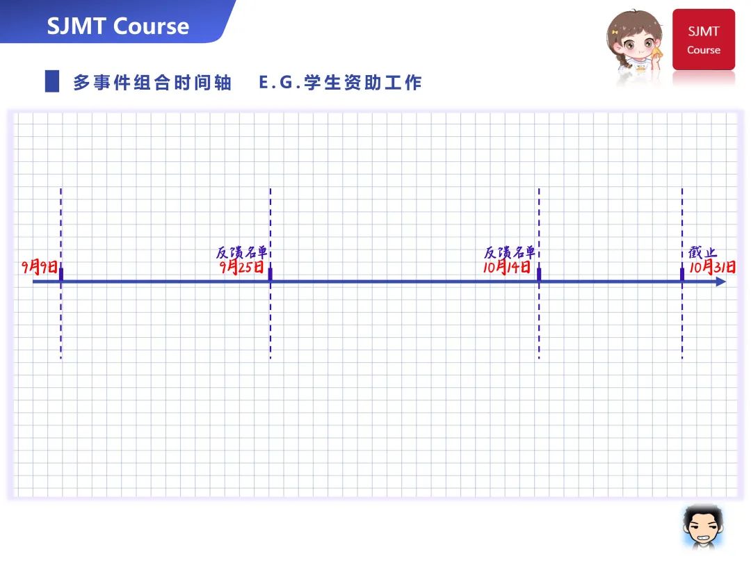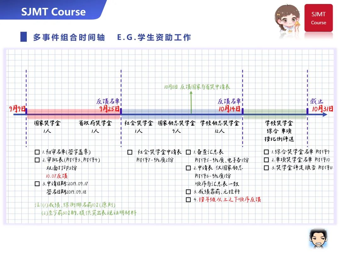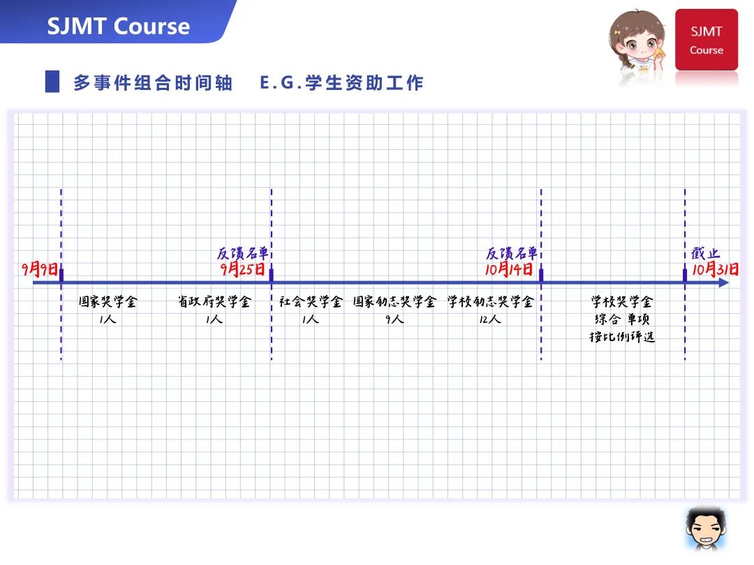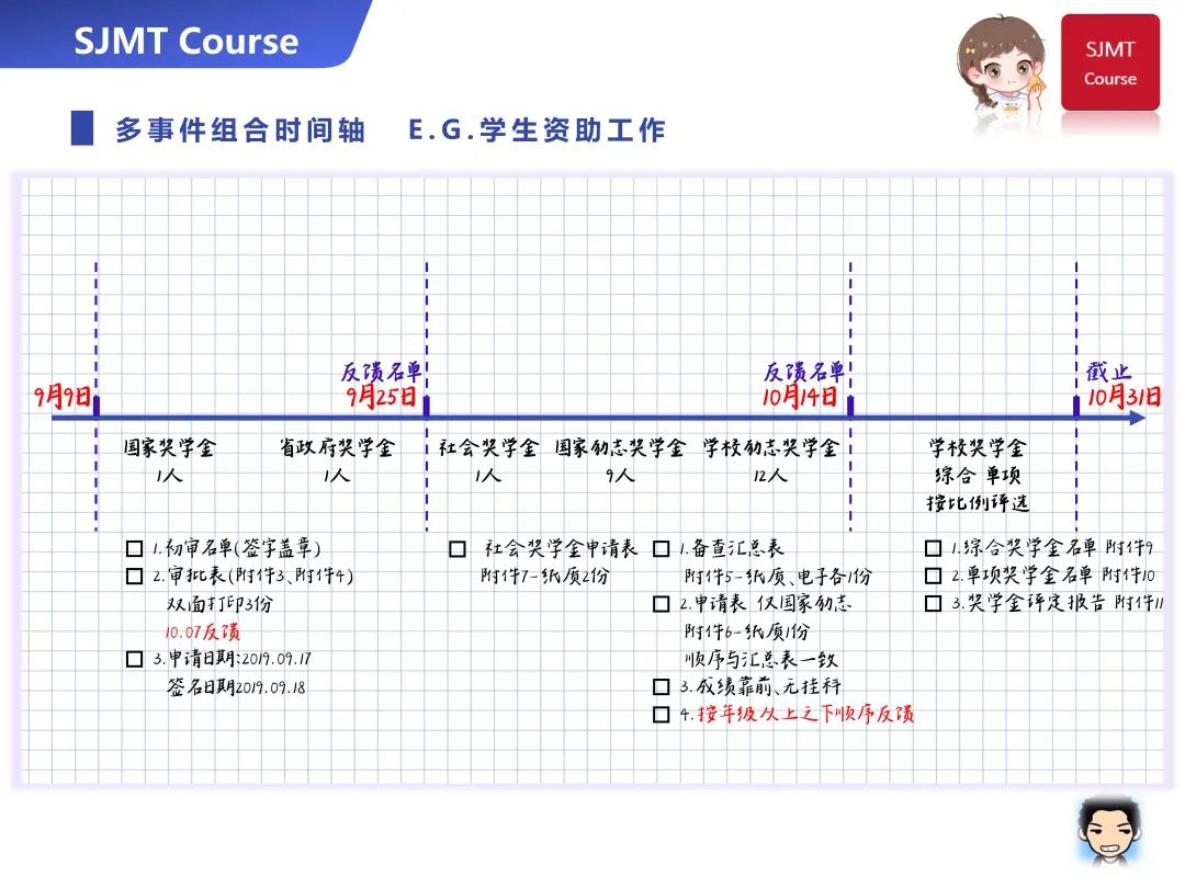 对于一个大段时间内的多重事件,如果能够按照时间点和时间段,进行准确的划分,再对多项事件的工作和注意要点进行罗列划分,可以使我们更有条理地处理事件。这时候,我们就需要一种新的时间断线检核表形式,就是多事件组合时间轴。在此,我们以学生资助工作的多事件组合时间轴为例: