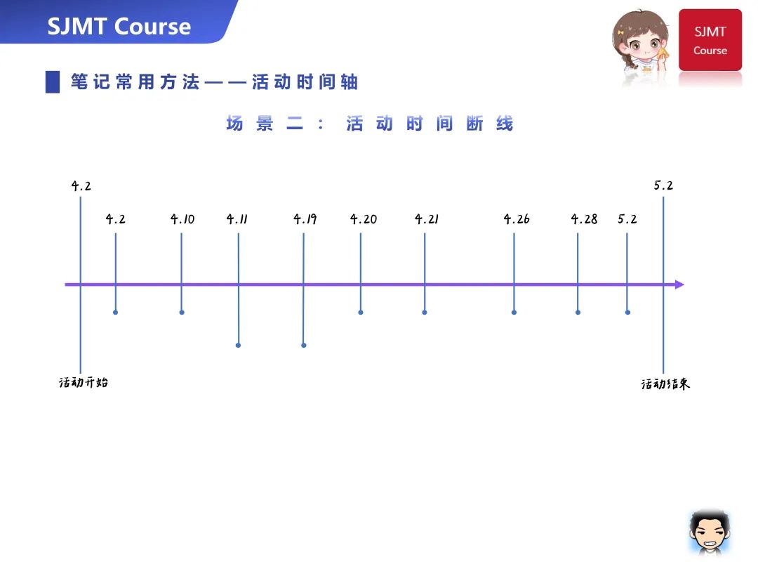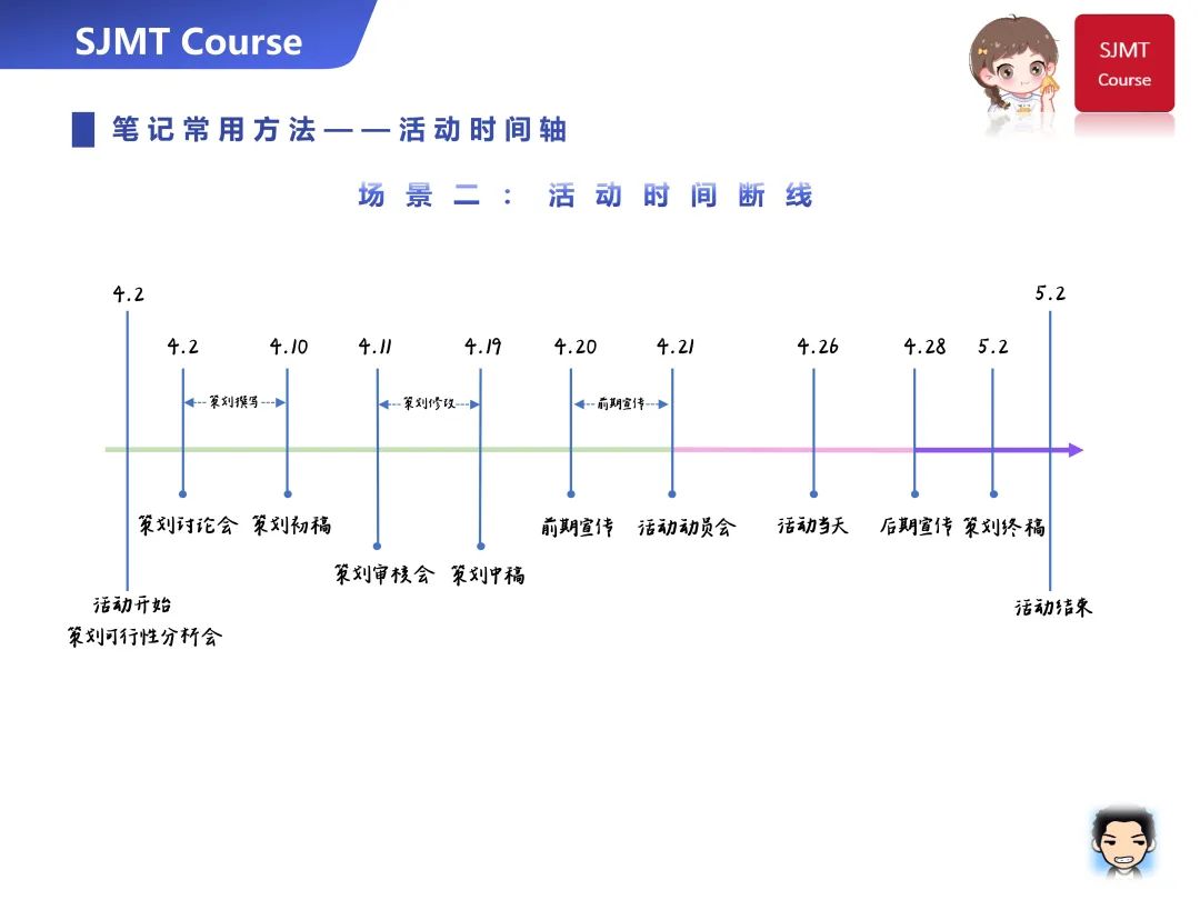 - TIP: 除常规画法之外,你还可以根据活动的不同分期,对时间轴进行不同的配色标记,按照活动的前、中、后期,搭配三种不同的颜色。