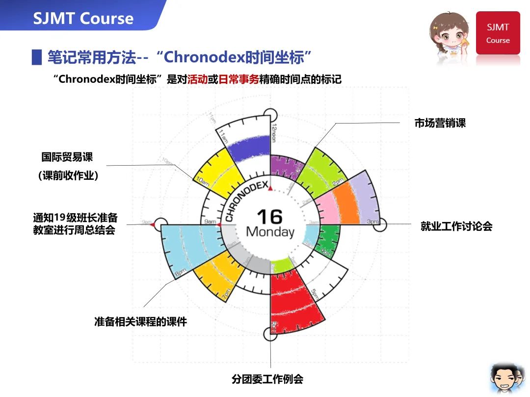 Chronodex时间坐标,也称为Chronodex时间饼,是在螺旋饼图中对活动或日常事务进行精确时间点的标记。