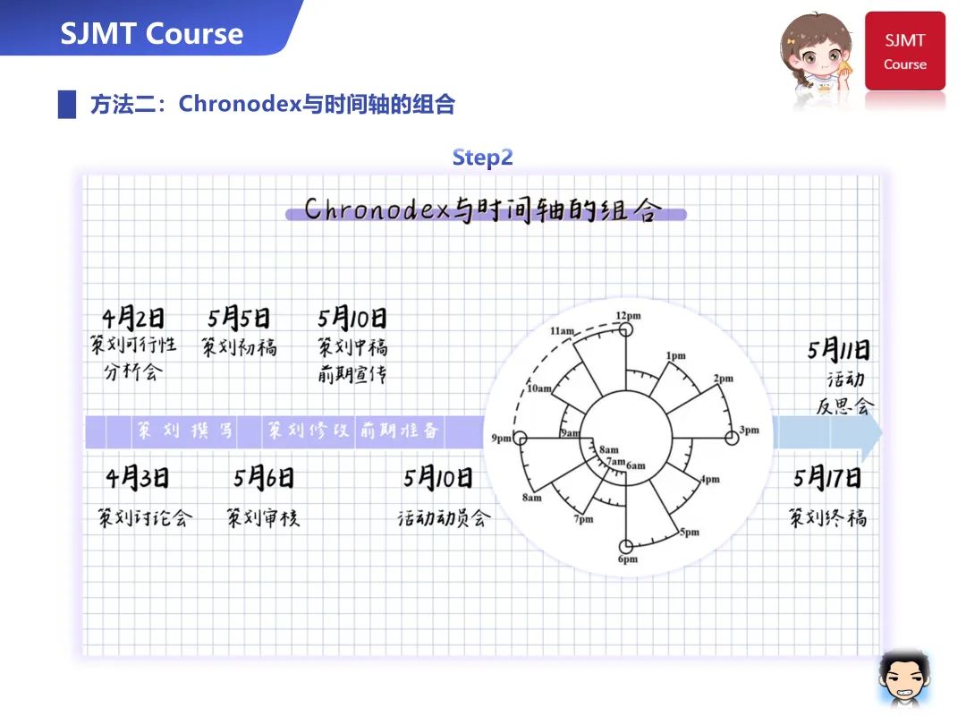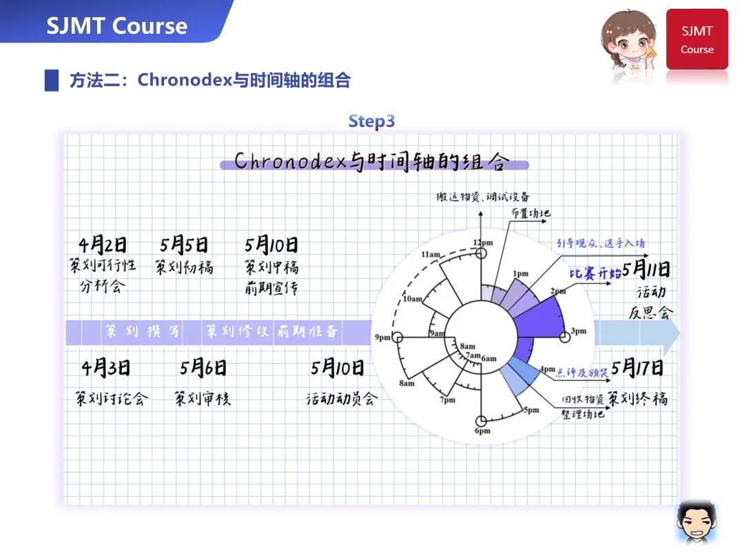 除了常规用法外,我们还可以将Chronodex与之前所学的时间轴进行组合,制作活动组合时间轴,用于活动的准确时间规划,其主要应用场景在一个活动从规划到最后落实的过程,用时间轴表示活动开展前后的各项事务,用Chronodex标记活动当日的相关事项,具体制作方法如下。