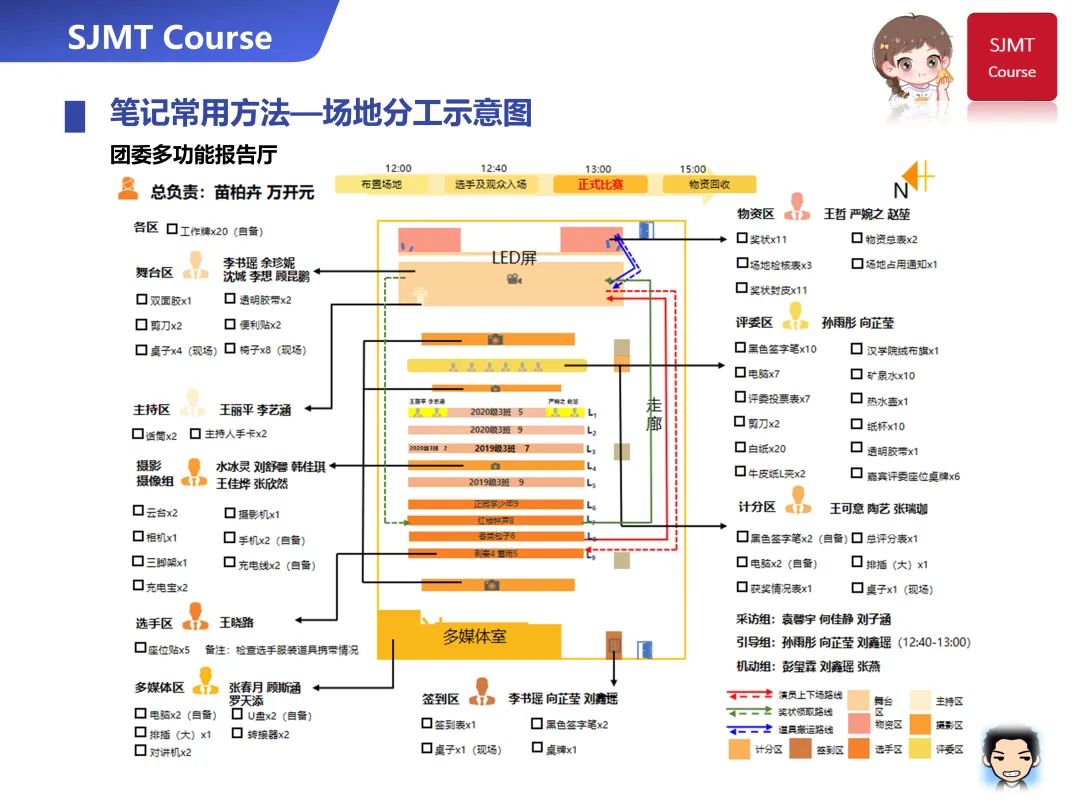场地分工示意图是通过绘制简单的场地、相应的工作区域和工作人员,从而对工作人员进行合理分工的图示类笔记。