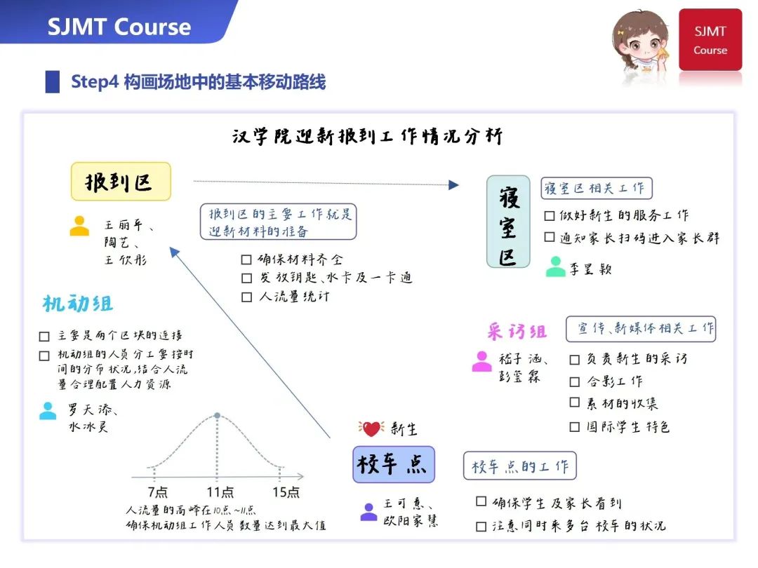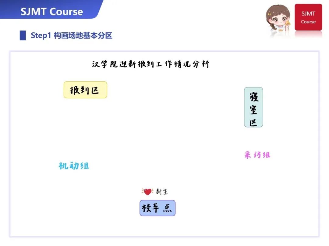 此处的移动路线为新生报到时在各个场地间的移动路线,将有关的场地相关联,明确整体工作流程。