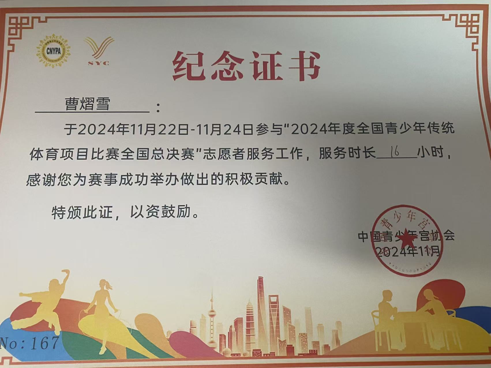 赛事结束时,曹熠雪同学累计服务时长达 16 小时,她用实际行动诠释了新时代青少年的担当:不局限于完成既定任务,更主动拓展服务深度;不畏惧繁琐与辛劳,始终以赤诚之心对待每一份责任。