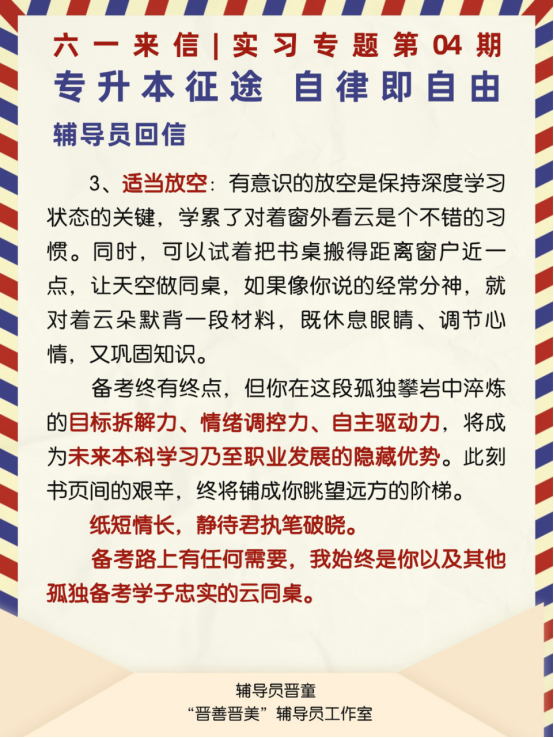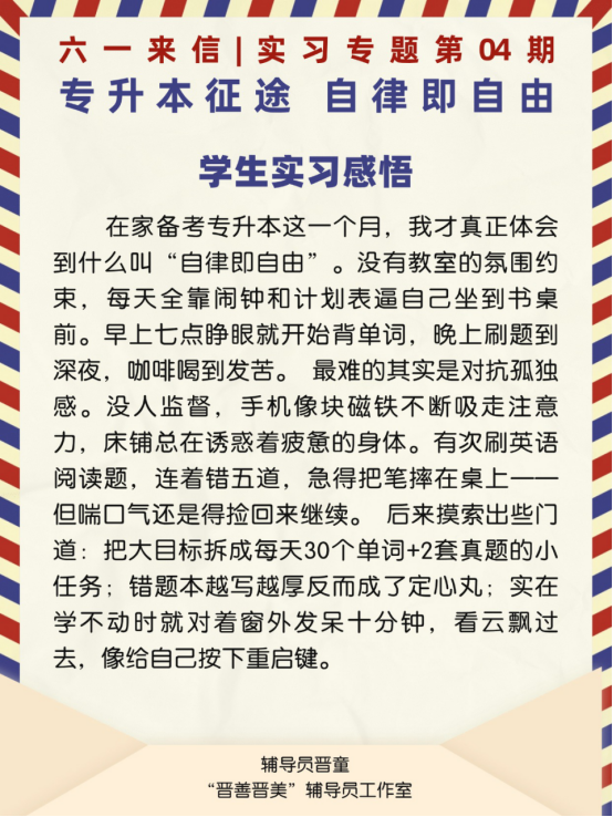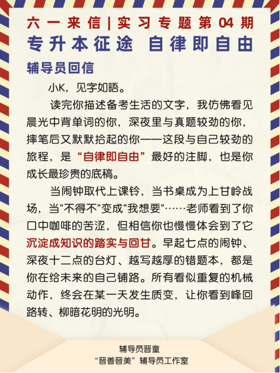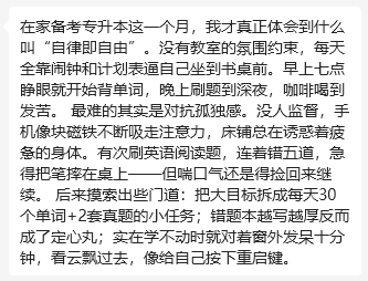 读完你描述备考生活的文字,我好似看见晨光中背单词的你,深夜里与真题较劲的你,摔笔后又默默拾起的你——这段与自己较劲的旅程,是“自律即自由”最好的注脚,也是你成长最珍贵的底稿。