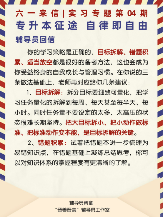你的学习策略是正确的,目标拆解、错题积累、适当放空都是很好的备考方法,这也会成为你受益终身的自我成长与管理习惯。在你说的三条做法基础上,老师再对应给你几条建议: