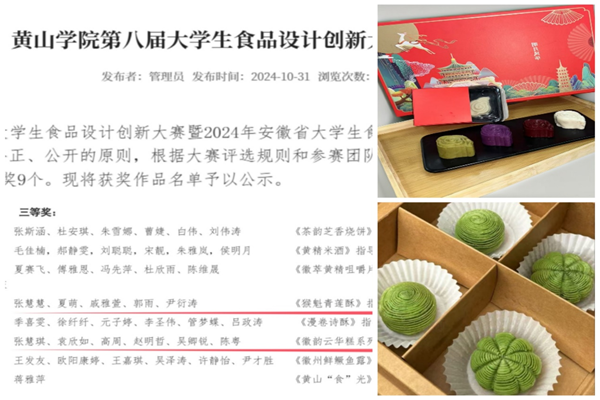 烹饪与营养教育专业为省级特色专业,旅游学院从专业育人的角度,融合专业建设和廉洁文化建设一体推进,借助承办校食品设计创新大赛之机,选派学生以清廉为主题设计作品。其中项目主持人章勤指导的《猴魁青莲酥》、《徽韵云华糕系列》廉洁作品获得校级食创竞赛三等奖。廉洁食创既体现了学生的专业素养,也展示了学生们廉洁有为的人生志向。
