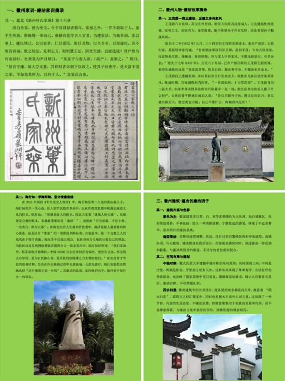 徽文化,是中华优秀传统文化的重要组成部分,蕴含着丰富的廉洁因子。旅游学院从“徽风廉韵”促“徽风皖韵”的视角,通过挖掘徽州故事、名人、家训、建筑中蕴含的廉政因子,通过积极打造廉洁文化故事汇启智润心。一方面,挖掘徽文化中蕴含的廉洁故事,编辑成读本;另一方面,在学生党支部举办徽州廉洁故事宣讲活动,营造浓郁的廉洁文化氛围,增强学生党员干净做人、规范做事、遵纪守法的自觉性。