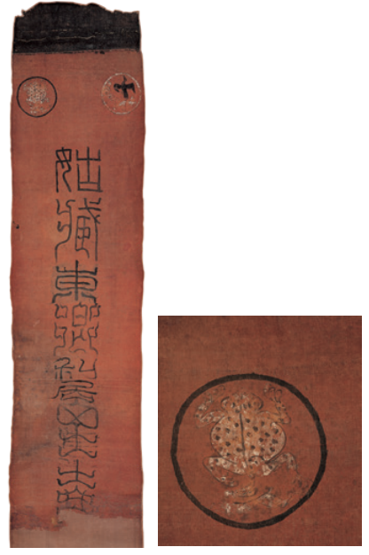 残体呈竖长方形。上端黑色天头较短,中下部为旌体,旌体下部及旌尾残缺。上部绘有圆形日、月图,左日图为白色轮廓,中有展翅的黑色三足乌和速奔的白色九尾狐;右月图为黑色轮廓,中有徐行的白色蟾蜍和快跑玉兔。日、月图下正中墨书竖行篆体“姑臧东乡利居里壶”等字。