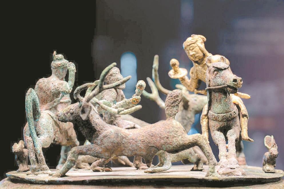 西汉的叠鼓形狩猎场面铜贮贝器,器盖上雕铸了生动立体的狩猎场面。(馆方供图)