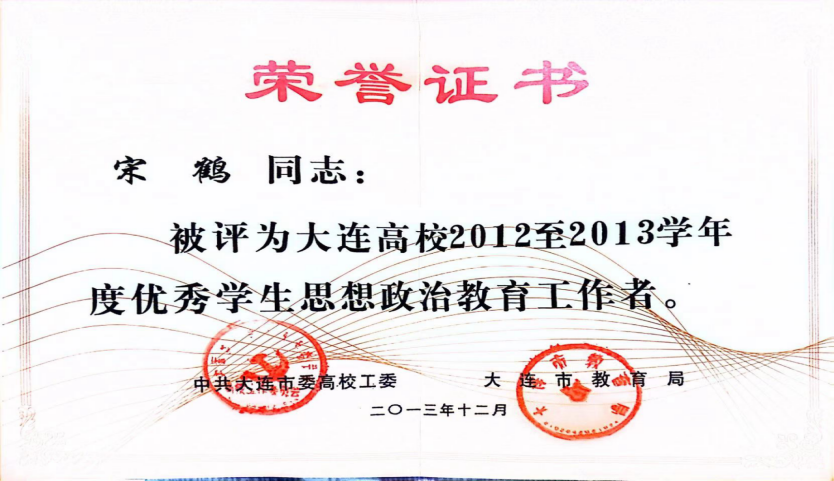 大连高校2012至2013学年度优秀学生思想政治教育工作者。
