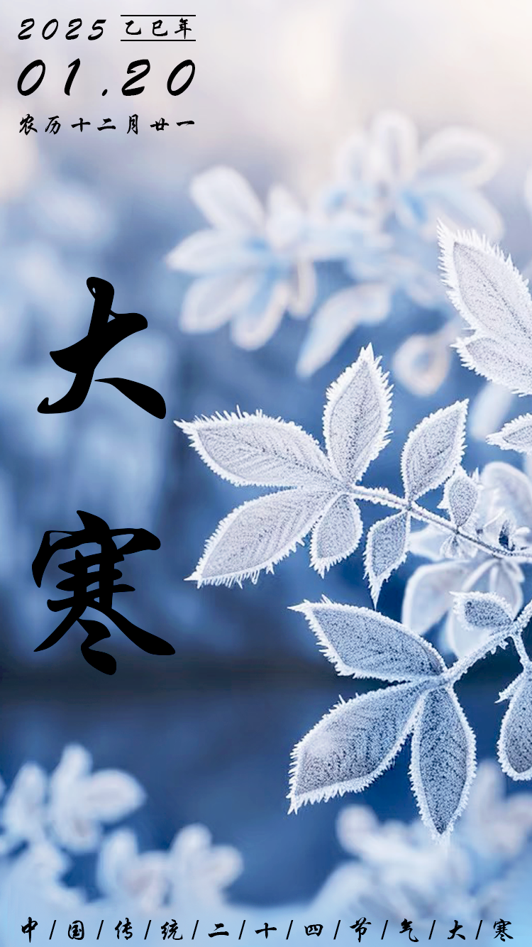 大寒,是二十四节气中的最后一个节气。大寒同小寒一样,都是表示天气寒冷程度的节气,大寒是天气寒冷到极致的意思,大寒节气处在三九、四九时段,此时寒潮南下频繁,是一年中的最寒冷时节。极言大寒之冷。这个气节处在三九、四九时段,此时寒潮南下频繁,是一年中的最寒冷时节,也是一年中雨水最少的时期。民谚云:“小寒大寒,无风自寒。”大寒,是天气寒冷到极点的意思。它是一个生机潜伏、万物蛰藏的时令