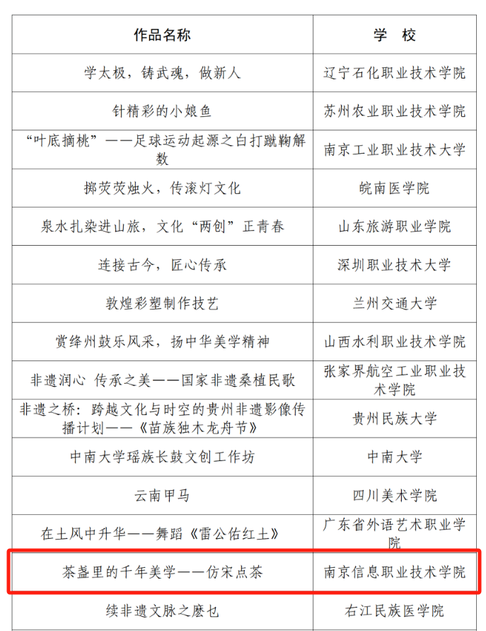 根据《教育部办公厅关于举办2023年高校“礼敬中华优秀传统文化”宣传教育活动的通知》(教思政厅函〔2023〕11号)工作安排,经学校推荐,1月23日,教育部公示了2023年高校“礼敬中华优秀传统文化”宣传教育活动结果,我校《茶盏里的千年美学——仿宋点茶》作品入“非遗学园”技艺比拼遴选名单。