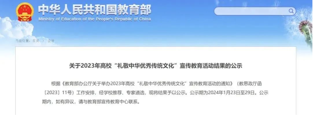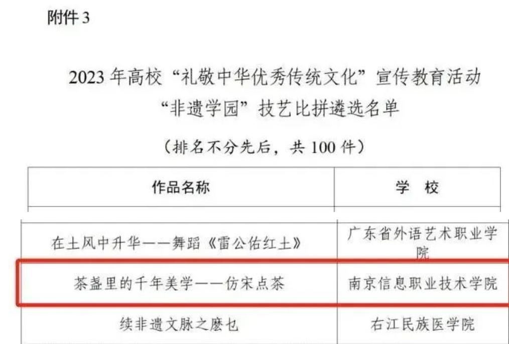 2024年1月23日,教育部公示了2023年高校“礼敬中华优秀传统文化”宣传教育活动结果,南京信息职业技术学院《茶盏里的千年美学——仿宋点茶》作品入“非遗学园”技艺比拼遴选名单。