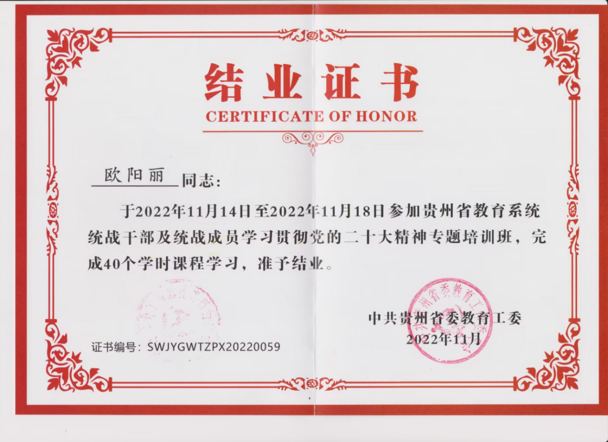 学习提升:欧阳丽老师参加贵州省教育系统统战干部及统战成员学习贯彻党的二十大精神专题培训班