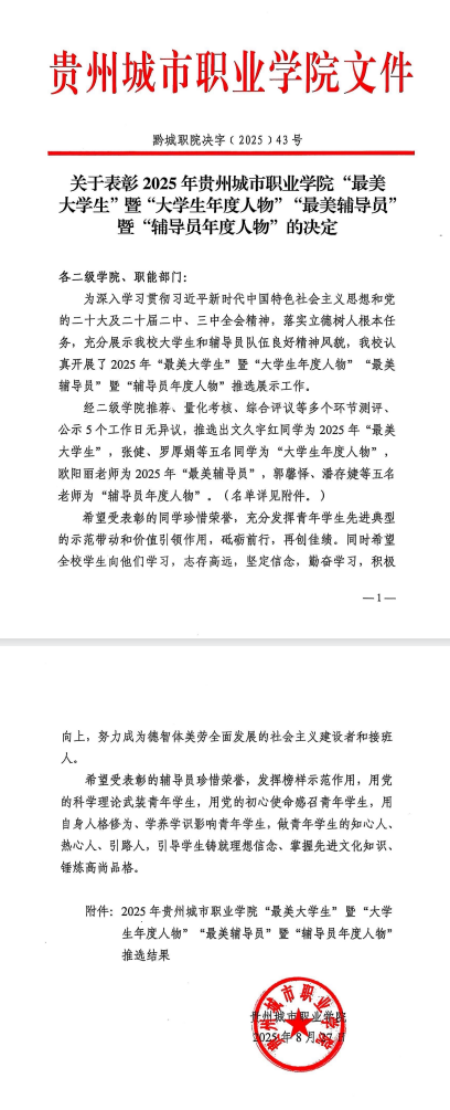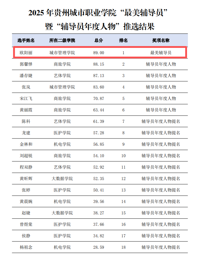 喜报————欧阳丽老师以辅导员第一名获学校“最美辅导员”表彰