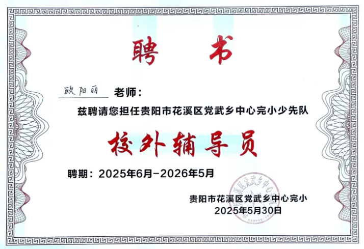 喜报——欧阳丽老师受聘为贵阳市花溪区党武乡中心完小“校外辅导员”