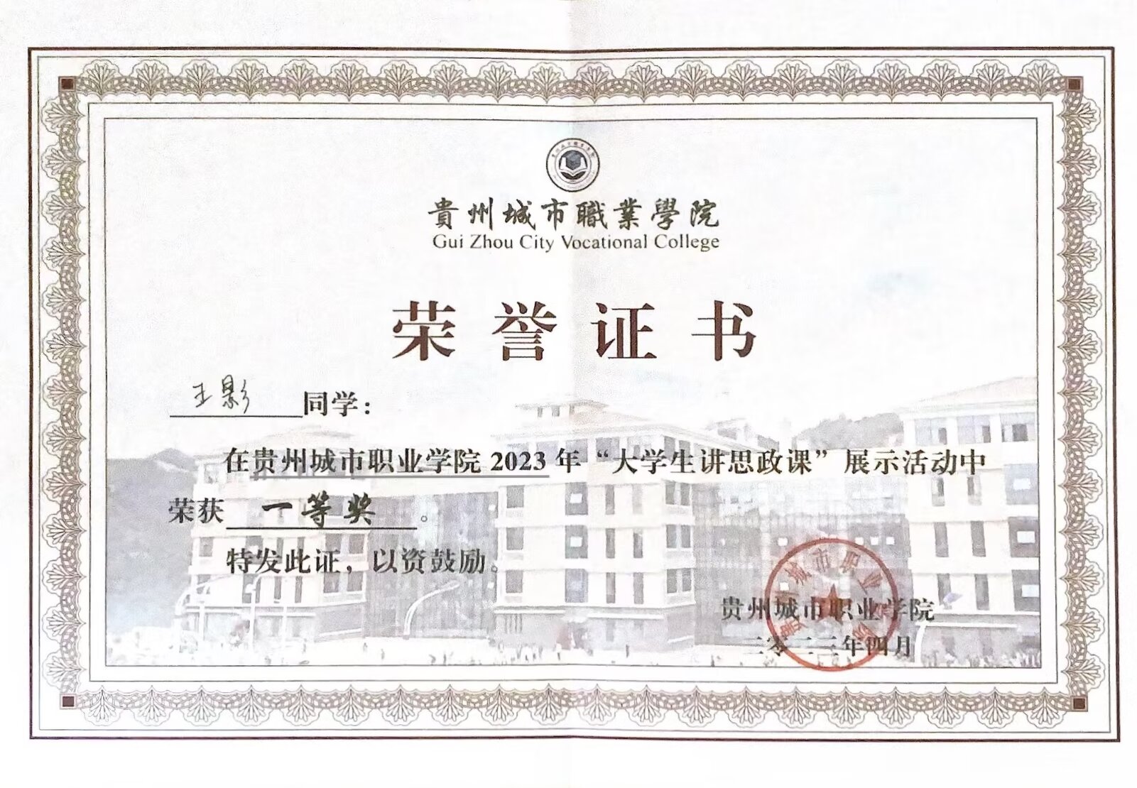 [荣誉]2023年在“大学生讲思政”中指导学生获校级一等奖