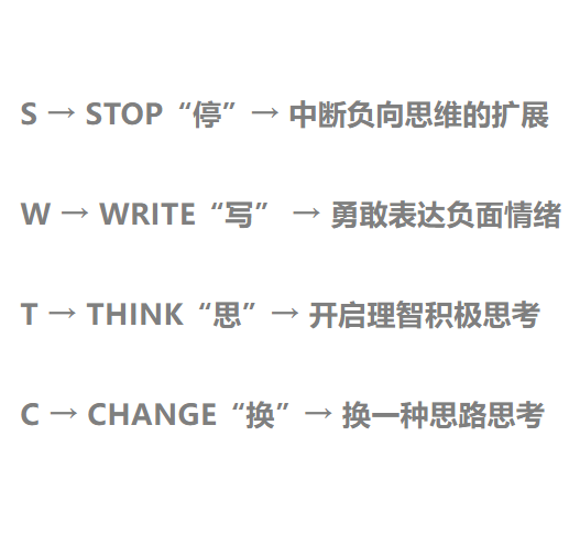 心理暗示是调整心态的法宝。遇到负面情绪时,不妨试试“SWTC”法去消极、聚积极。