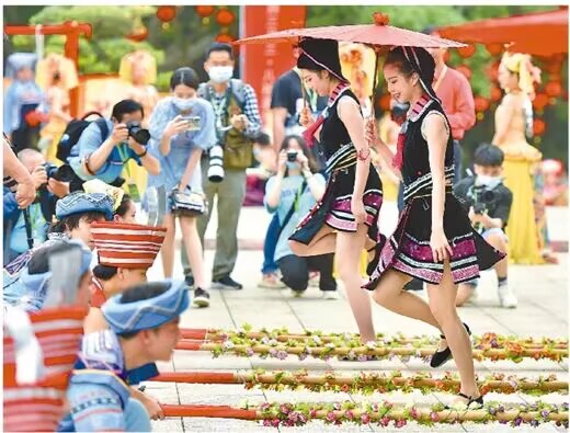 竹竿舞是广西三月三极具代表性的传统活动,极具民族风情。 在三月三的盛大节日里,广场、村头一片热闹欢腾,便是跳竹竿舞的场景。舞者们身着绚丽的壮族服饰,色彩夺目。场地中,数根长竹竿平行排列,两两一组,由专人手持并开合舞动。舞者们伴随着明快的节奏,敏捷地进退跳跃,在竹竿开合的瞬间精准移动脚步,时而单脚跳,时而双脚跳,动作灵活多变。 跳竹竿舞不仅考验舞者的协调性和节奏感,更是集体合作的体现。参与者需默契配合,跟随音乐韵律统一行动。这项活动有着深厚的文化内涵,它起源于劳作生活,后逐渐演变为庆祝节日、传递欢乐的重要方式,既展示了壮族人民的热情奔放,也凝聚着民族的团结与活力,为三月三增添了浓郁的节日氛围 。