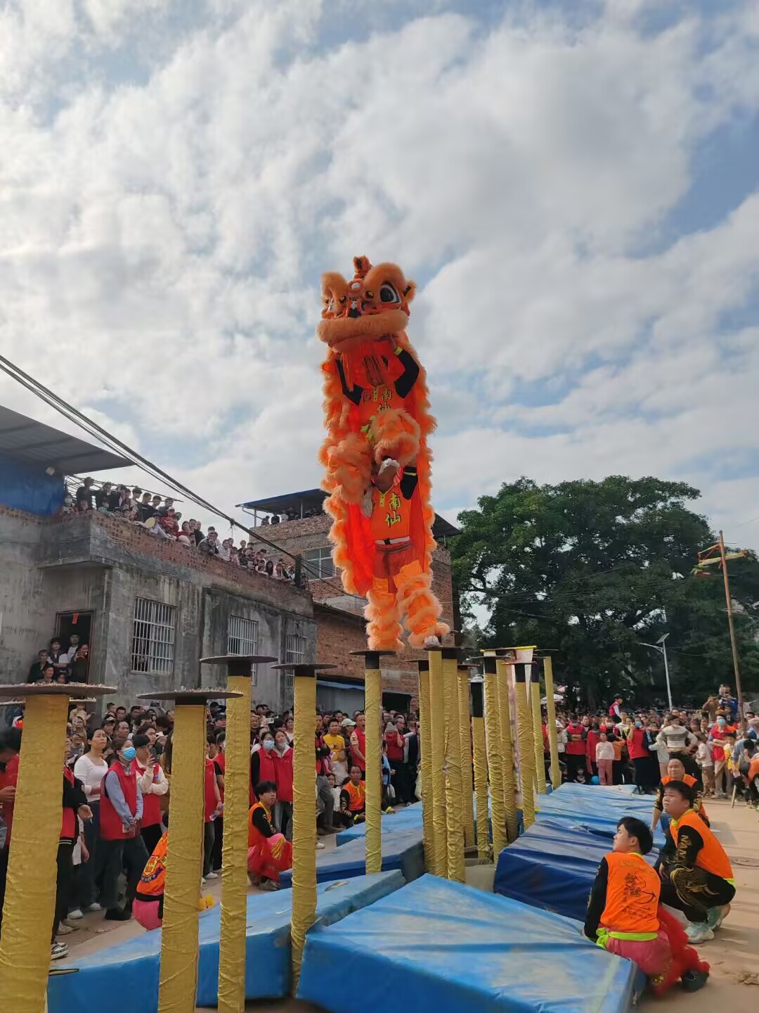 舞狮分为南狮和壮狮,南狮造型夸张,威武雄壮,通过细腻的动作展现狮子的喜、怒、哀、乐、动、静、惊、疑等神态;壮狮表演则有着高难、惊险、奇美的特点,如“狮子上金山”,将约35张长条凳叠成17层,高8.5米,表演者扮成狮子在晃荡的“金山”上跳跃、腾空、起舞,场面惊险,令人叫绝。 活动时,现场锣鼓喧天,节奏紧密,舞狮者们配合着鼓点,做出起势、常态、奋起、疑进、抓痒、迎宝、施礼、惊跃、审视、酣睡、出洞、发威、过山、上楼台等动作,一招一式都精准到位,将狮子的形态刻画得惟妙惟肖 ,引得观众阵阵喝彩。