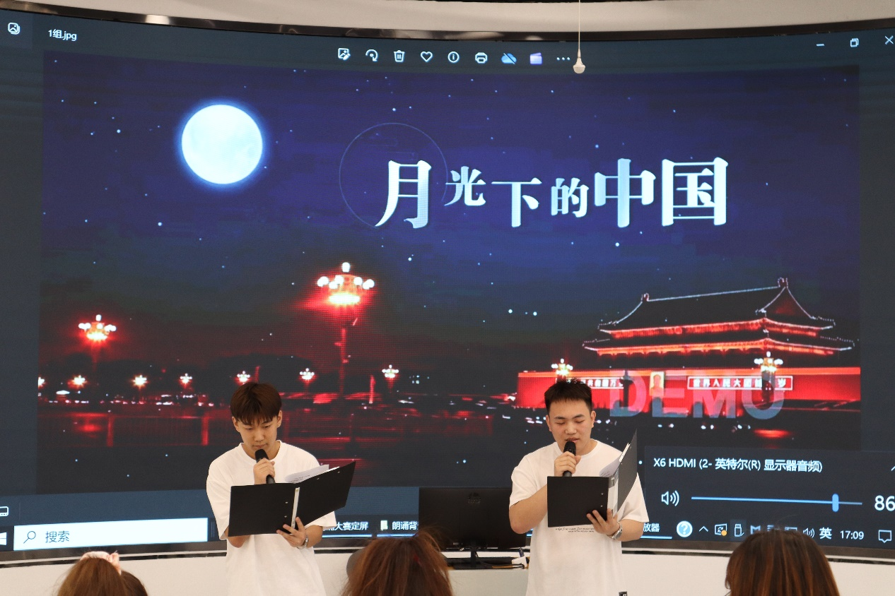 随后便进入了精彩的正式比赛环节,各组选手按照赛前抽签的顺序依次上场进行朗诵。吴汗、于天池同学以一首诗意蓬勃的《月光下的中国》拉开了比赛的序幕,刘炳欣同学合着配乐,带来了一首铿锵有力的《七月的天空》。