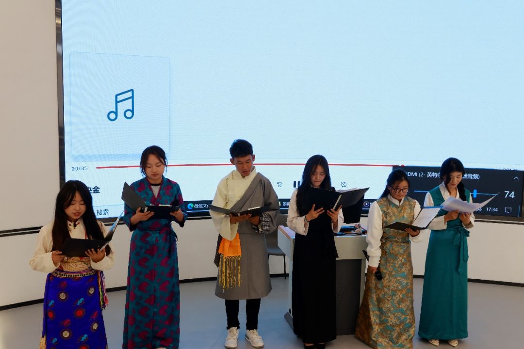 刘远宜同学诵咏着经典诗歌《英雄》,那动情的声线将情感及朗诵完美结合,深情歌颂的信念感染了在场的每一个人。值得一提的是,由学院六名藏族同学组成的藏族代表队,身着他们具有独特风情的民族服饰为大家带来了特别的藏语诗朗诵,充分展现了少数民族文化的独特魅力。