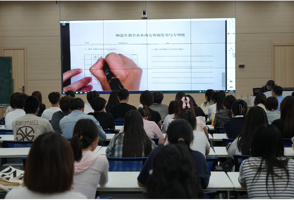 培训后同学们进入了正式比赛环节,分别前往知行楼129智慧书法实训室和130板书实训室进行钢笔字和毛笔字的书写,粉笔字书写采取评委现场打分形式,钢笔则在收齐作品后由评委统一打分。经过培训,同学们落笔更加自信,书写效果明显增强。