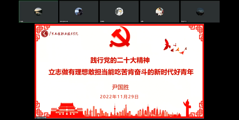 为深入学习领会党的二十大精神,落实新要求,勇担新任务,展现新作为。11月29日,艺术设计学院召开“学思践悟二十大,砥砺奋进新征程”主题党日活动,参加活动的有学校党委委员、副校长揭英荣,学院党总支书记张华、学院党总支副书记焦英、以及学生党支部全体党员,本次活动线上、线下结合方式召开,活动由学生党支部书记胡静燕主持。