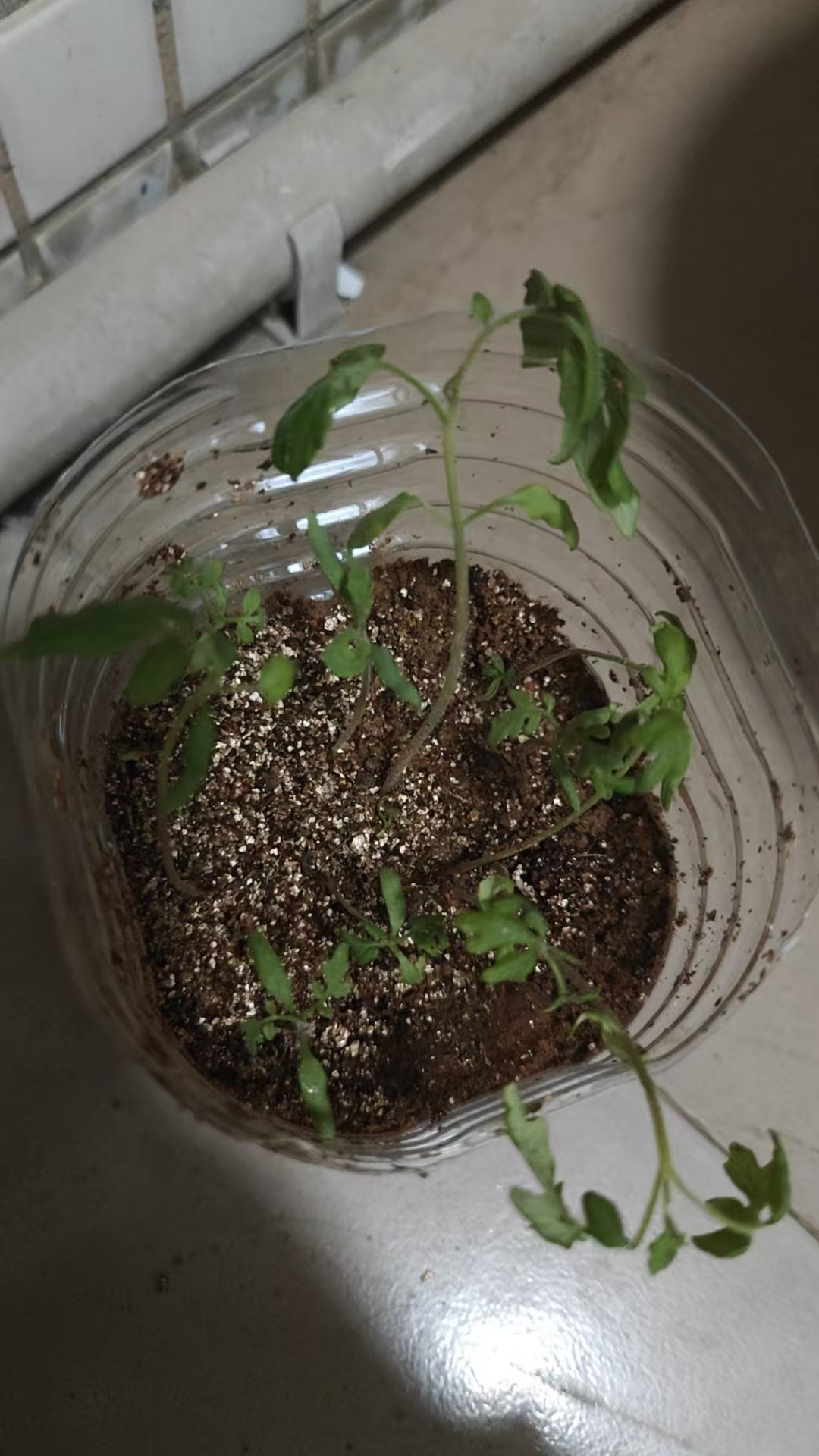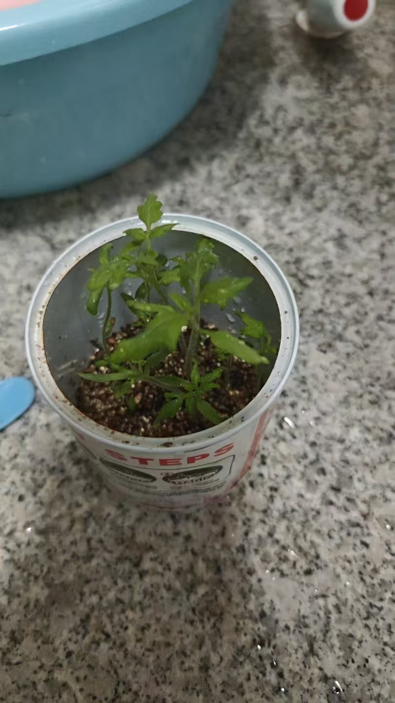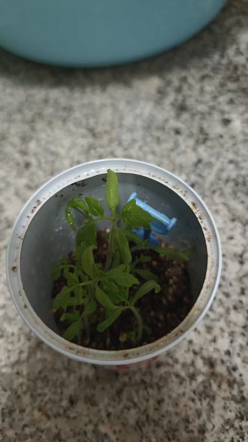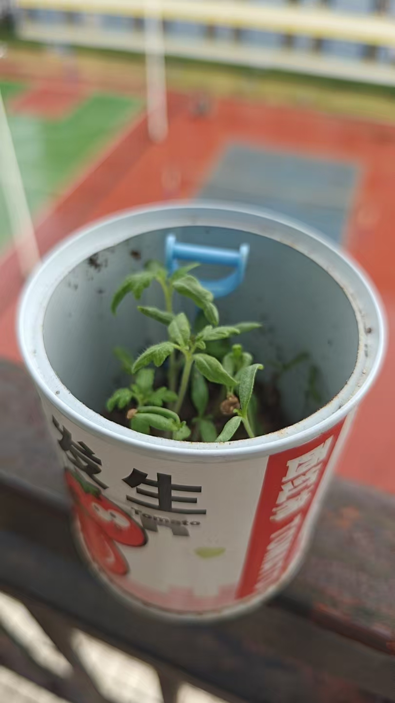 番茄植株较为幼小,叶片翠绿但略显柔弱,在简易容器中扎根生长。期望它能汲取养分,茁壮成长,枝叶繁茂,早日结出饱满诱人的果实。
