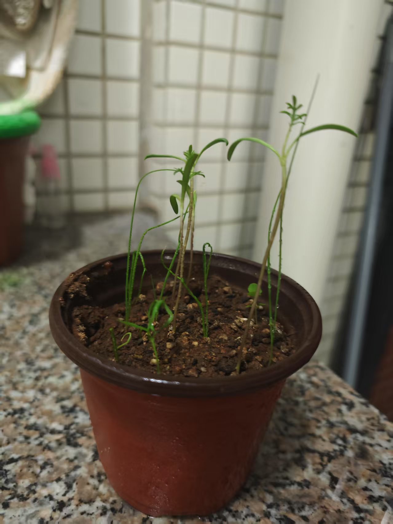 今天波斯菊幼苗又给了我新惊喜!它们的茎干更粗壮了些,叶片也不再是单纯的嫩绿,隐隐有了更浓郁的绿意。几株幼苗错落生长,在花盆里摇曳生姿,仿佛在欢快地舞蹈。
