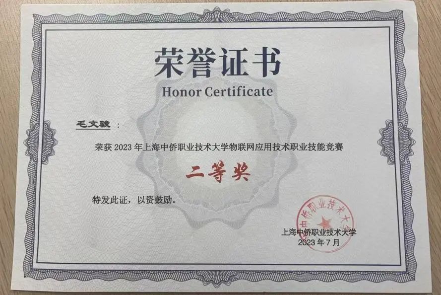 在课外科技创新活动方面,毛文骏始终坚持“以赛促学、以赛促研”的学习理念,积极参加校内外各类科技创新、技能竞赛与创业项目实践。他曾多次担任参赛项目的队长,组织团队进行方案设计、任务分工与项目实施,注重团队合作与资源整合能力的锻炼。2024年,在上海市职业院校技能大赛中,他首次作为队长代表学校参赛,获得“物联网应用开发”赛项二等奖。随后,在总结经验、不断优化项目方案和技术细节的基础上,他又带领团队参加2024年世界职业院校技能大赛,凭借出色的项目表现,荣获该赛项金奖。这一成绩不仅充分展现了他扎实的专业功底和优秀的实践能力,也体现了其不断追求卓越、突破自我的奋斗精神。